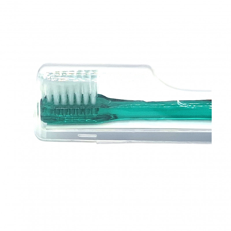 Die Zahnbürste wird in den Farben Hellblau, Grün und Rosa gemischt geliefert.