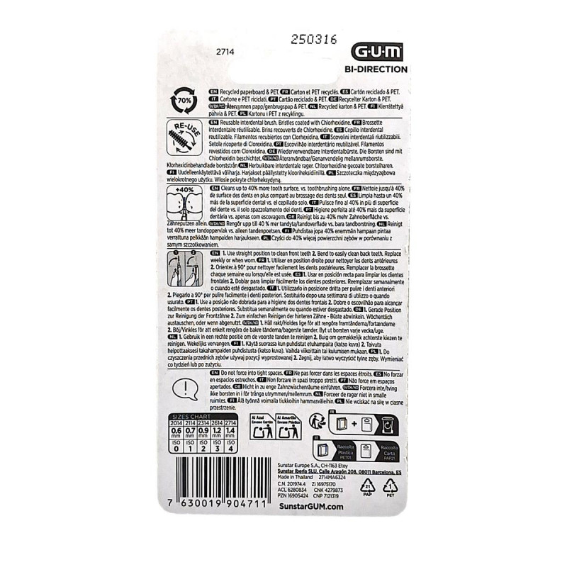 Mit der GUM Bi-Direction 1,4mm Interdentalbürsten genießen Sie eine besonders gründliche und schonende Reinigung Ihrer Zahnzwischenräume, auch an schwer zugänglichen Stellen wie den Backenzähnen. Das Besondere an der GUM Bi-Direction ist ihr um 90° abgewinkelter Bürstenkopf, der dank seines langen Griffs selbst die hintersten Zahnzwischenräume spielend erreicht. Der beschichtete Draht gewährleistet eine sichere Handhabung ohne Verletzungsrisiko. Besonders vorteilhaft ist die antibakterielle Chlorhexidin-Beschichtung der Borsten, welche zwischen den Anwendungen für Hygiene sorgt und somit das Risiko von Keimbildung minimiert. Ideal geeignet ist die Bürste zudem für Implantate sowie kieferorthopädische Apparaturen.