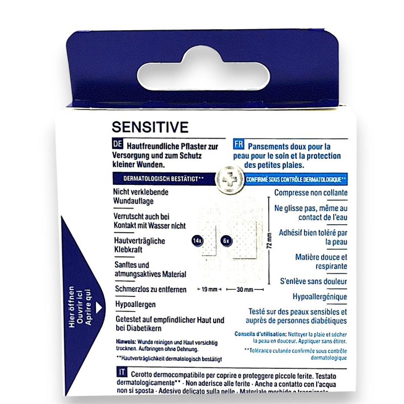 Hansaplast Sensitive Strips 20 Stück: 14x 72mm x 19mm und 6x 72mm x 30mm.