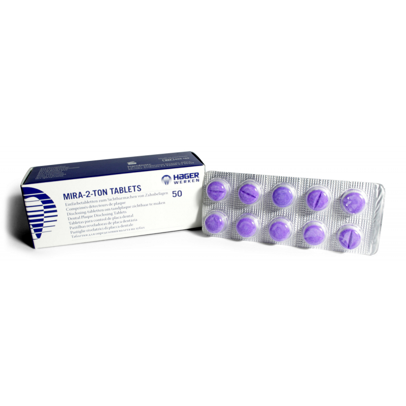 Mira 2 Ton zeigt die Stellen die besondere Pflege benötigen. Um Zahnfleisch und Zähne gesund zu halten, ist es wichtig, regelmäßig die Plaque zu entfernen. Mit einer Färbetablette wird schnell und einfach geprüft, ob alle Bereiche gründlich gereinigt sind. Ein besonderer Vorteil dieser Einfärbetabletten ist das älterer Zahnbelag dunkelblau und der neuere lila-rot angezeigt wird.