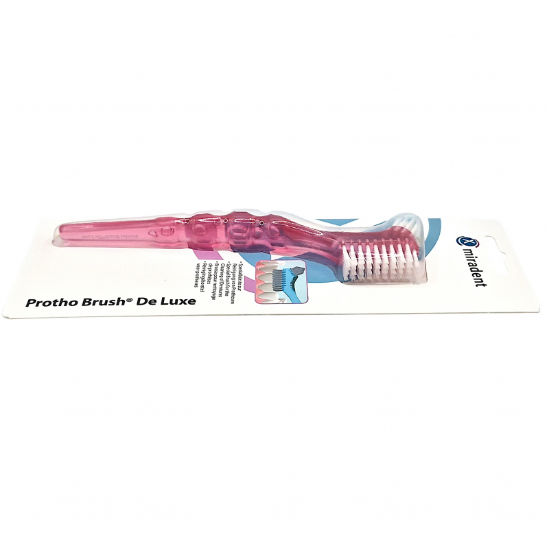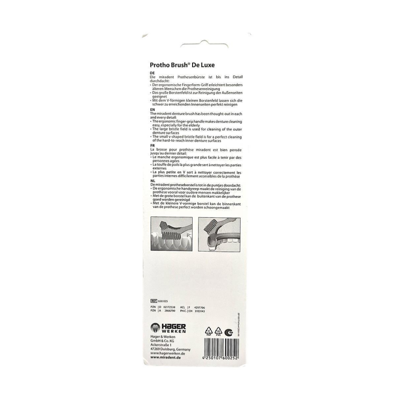Für eine gründliche und einfache Reinigung Ihrer Prothese: Die Miradent Brush De Luxe verfügt über einen speziell geformten, ergonomischen Griff, der sich besonders für ältere Anwender eignet. Das große Borstenfeld ist ideal für die umfassende Reinigung der Innen- und Außenflächen. Mit dem zusätzlichen, kleineren Borstenfeld erreichen Sie mühelos auch schwer zugängliche Bereiche, sodass Ihre Prothese hygienisch sauber wird.